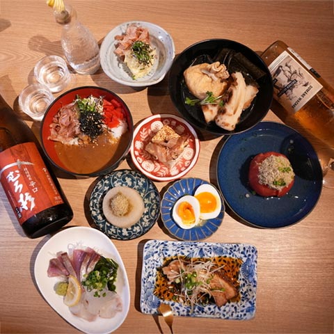 | 焼酎 | 【芋】桜島 黒麹/黒よかいち/黒霧島/芋盛り/西海の薫 黒麹/伊佐大泉/さつま寿/黒甕/かんろ/問わず語らず名もなき焼酎 【焼き芋】鬼火 【麦】一番札 【黒糖】れんと 【そば】玄庵 【泡盛】久米島久米仙 |