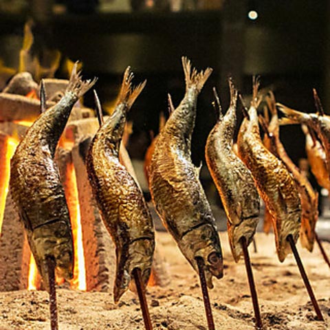 本格原始焼きもお店の自慢。様々な新鮮魚介や地鶏を炭火で炙り、外はカリッと、中は食材の旨みを閉じ込め、ふんわりと焼き上げて提供しています。