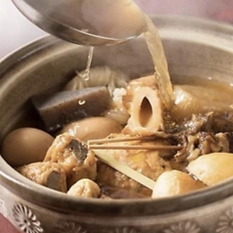 こだわりの京出汁で炊いたおでんはお店の名物。こちらをお通し代で食べ放題。食材をじっくり煮込み旨味しみ出る京都らしい上品な優しさをです。