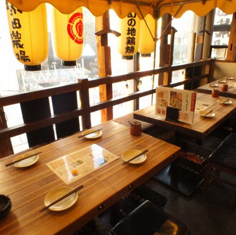 農場の雰囲気と提灯が演出する活気溢れる店内。テーブル席でワイワイみんなで楽しみながら地鶏を堪能。
