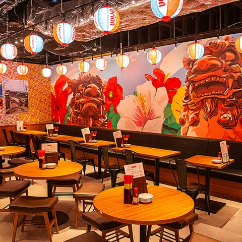 沖縄の古民家をイメージさせるインテリア。沖縄独特の赤瓦屋根や、ビールの樽を椅子にするなど細かなところにもこだわっています。