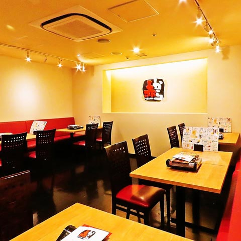 モダンレトロな店内はワイワイ騒げるテーブル席と、ゆったり寛げる広々とした掘りごたつ席が多数。