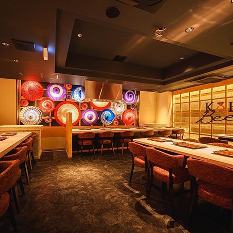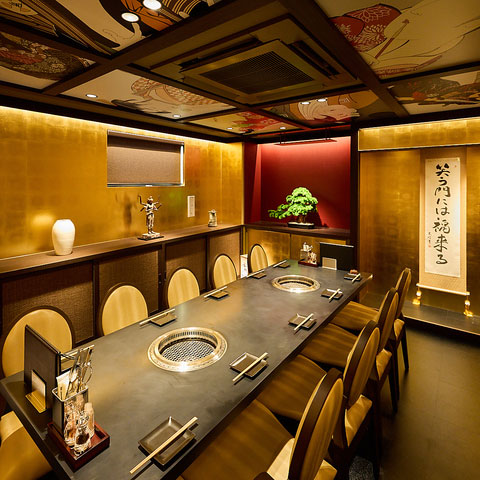 黄金の壁紙と浮世絵が織りなす荘厳な雰囲気。焼肉店に珍しい円卓テーブルでみんなの顔を見ながら焼肉と会話を楽しめます。