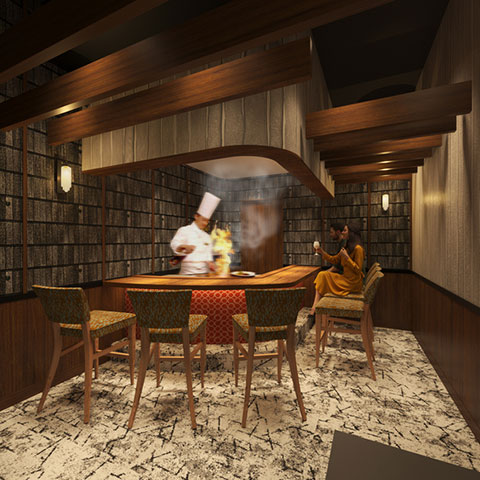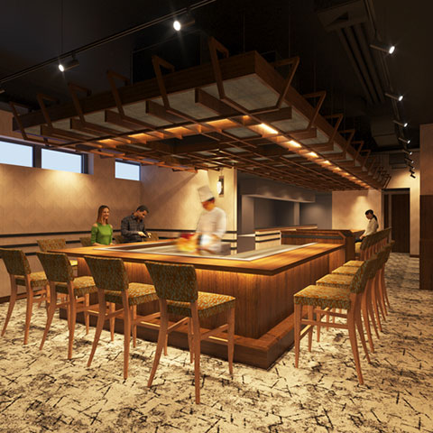 ラグジュアリで高級感溢れるインテリア。すべての席から鉄板が見える全席カウンターが自慢。臨場感溢れる職人のサービスを目の前で。