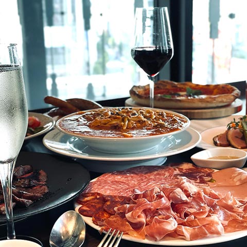 本格窯焼きピザをはじめ、こだわりのアラカルトメニューに世界中から厳選したワインを用意。