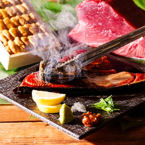 生ウニのせ本マグロ断面刺し 炭火炙りレアステーキ
