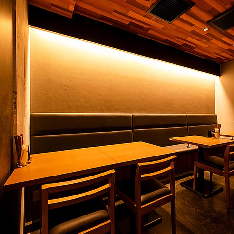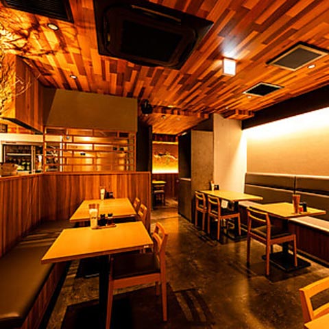 ウッディに統一されダウンライトが温かい灯りを灯す心地よい空間。お一人様から団体まで、色々な用途に利用できるカジュアルさ。