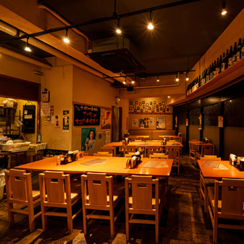ウッディに統一されダウンライトが温かい灯りを灯す心地よい空間。お一人様から団体まで、色々な用途に利用できるカジュアルさ。