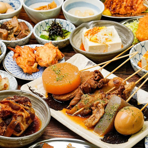 メニューブック対象!名物「まぐろのモツ煮込み」や「ごっつ揚げ」、本日のお刺身やおでん全種まで、全40種以上が食べ放題。