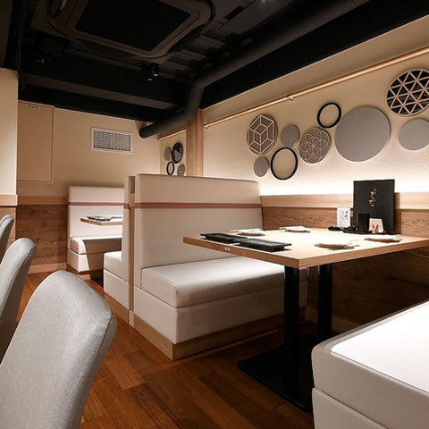 洗練されたインテリアの上質空間なので、女子会や接待にもぴったり。焼きの臨場感を味わえるオープンキッチンのカウンター席はデートに◎