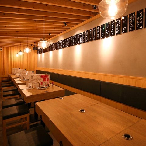 大衆酒場を謳いながらも清潔感のある店内。テーブル席が多く、会社帰りや学校帰りにふらっと立ち寄れて仲間とワイワイ楽しめる。